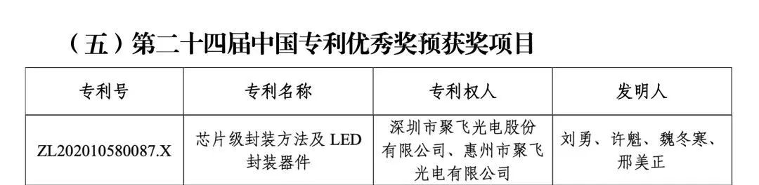 了解更多 >近日,國(guó)家知識(shí)產(chǎn)權(quán)局公布第二十四屆中國(guó)專(zhuān)利獎(jiǎng)評(píng)審結(jié)果并公示,聚飛光電“芯片級(jí)封裝方法及LED封裝器件”(專(zhuān)利號(hào):ZL202010580087.X)專(zhuān)利榮獲“中國(guó)專(zhuān)利優(yōu)秀獎(jiǎng)”,繼“一種LED支架及具有該支架的LED”(專(zhuān)利號(hào):ZL201110115645.6)獲得第二十屆中國(guó)專(zhuān)利優(yōu)秀獎(jiǎng)后再獲此殊榮。